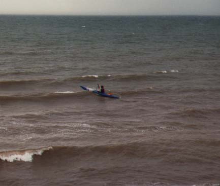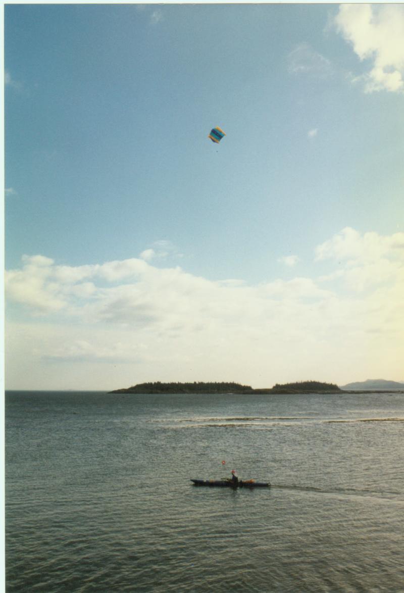 J'ai donc suivi mon plan original en demeurant très concentré, j'avais apporté de la nouriture et une caméra jetable imperméable, mais dans le feu de l'action je n'ai jamais pu manger ou prendre une photo, le rythme étant infernal. J'ai mis seulement trois heures à me rendre au chalet de l'Anse au sable. En touchant la cote je n'ai même pas pu débarquer de mon kayak que la corde de cerf-volant s'est brisée. Comme première expérience au cerf-volant s'en était toute une.